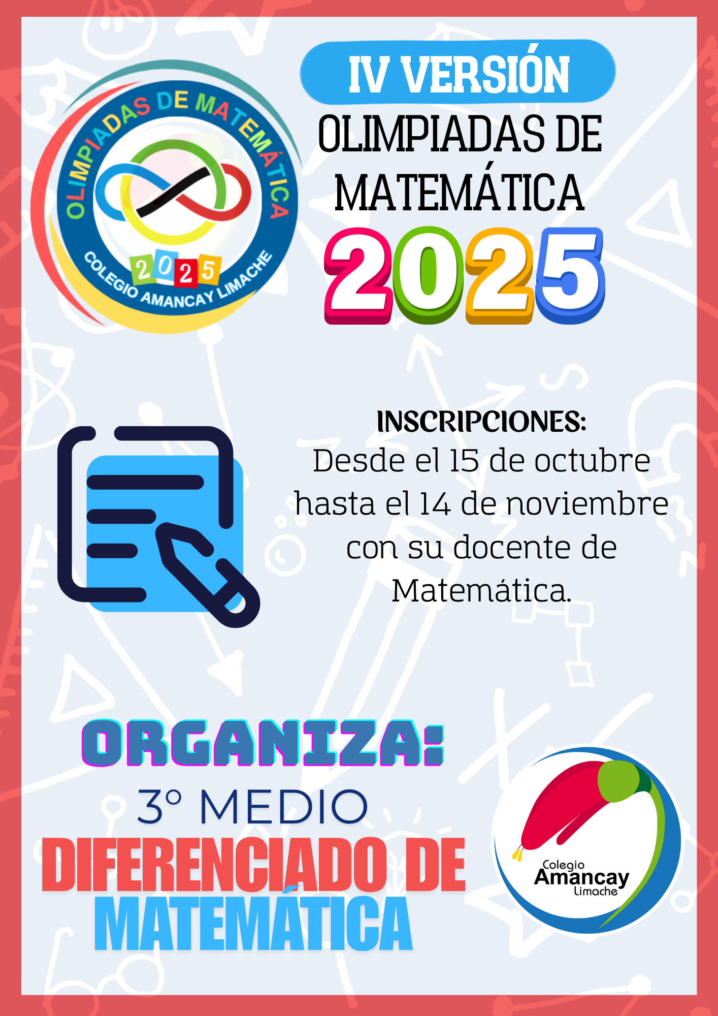 Invitamos a todos y todas las estudiantes de nuestra comunidad Amancay a participar en la IV Versión de las Olimpiadas de Matemática, que se llevará a cabo los días 26, 27 y 28 de noviembre.